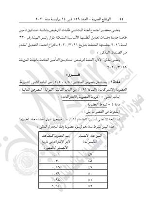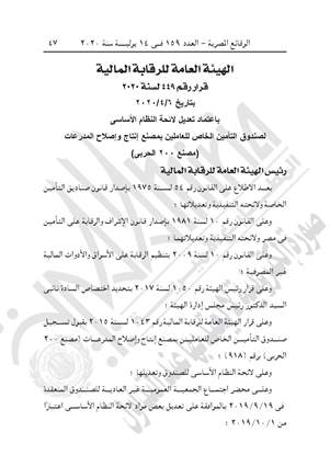 والقرار رقم 449 لسنة 2020، باعتماد تعديل لائحة النظام الأساسى لصندوق التأمين الخاص للعاملين بمصنع إنتاج وإصلاحات المدرعات (مصنع 200 الحربى)