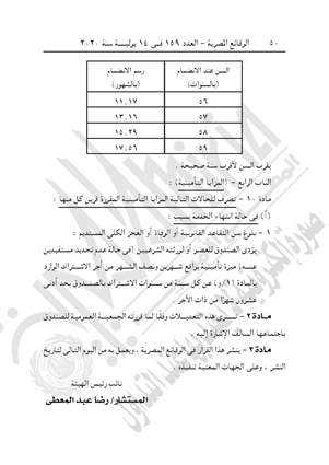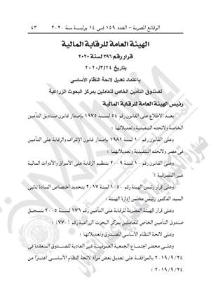 والقرار رقم 396 لسنة 2020، باعتماد تعديل لائحة النظام الأساسى لصندوق التأمين الخاص للعاملين بمركز البحوث الزراعية.