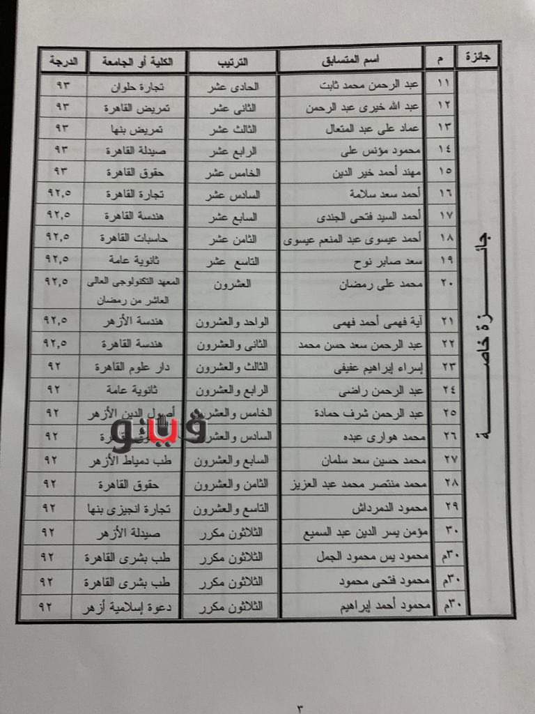 وأوضح أن الجامعة قررت زيادة عدد الفائزين من الطلاب ليكونوا ٣٠ طالبا ومن الخريجين 19 فائزا وذلك بدلاً من أول عشرة متنافسين كما كان مقررا، مشيراً إلى أنه سيتم منح الفائز الأول لكل من الطلاب والخريجين عشرة آلاف جنيه لكل منهما ، والثاني خمسة آلاف جنيه، والثالث ثلاثة آلاف جنيه، فيما يحصل الفائزين من الرابع حتى العاشر على الف جنيه، وباقي الفائزين علي جائزة خاصة قيمتها مبلغ 500 جنيه لكل منهم بالإضافة إلي شهادة تقدير من جامعة القاهرة. وأشار رئيس جامعة القاهرة، إلي أنه سيتم تحديد موعد توزيع شهادات التقدير وتكريم الفائزين مع بداية العام الدراسى الجديد.