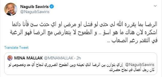 وكان أحد متابعي المهندس نجيب ساويرس على تويتر قد وجه له سؤالا قال فيه: " إزاي بتوازن بين الرضا الذي تعيشه وبين الطموح الضروري لنجاح أي حد وخصوصا لو كان رجل أعمال في نجاح حضرتك؟".