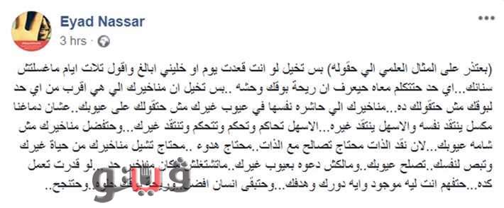 وكتب إياد عبر حسابه على موقع التواصل الإجتماعي "فيس بوك": "(بعتذر على المثال العلمي اللي هقوله) بس تخيل لو أنت قعدت يوم أو خليني أبالغ وأقول تلات أيام ماغسلتش سنانك... أي حد هتتكلم معاه هيعرف إن ريحة بوقك وحشة.. بس تخيل إن مناخيرك اللي هي أقرب من أي حد لبوقك مش هتقولك ده".