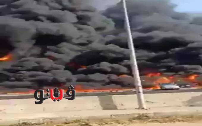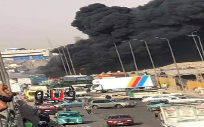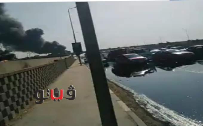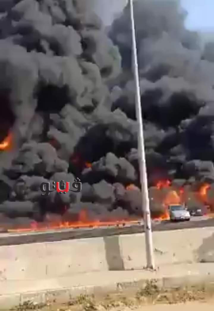 التهمت النيران 8 سيارات كانت متواجدة أعلى طريق الإسماعيلية الصحراوى ، أثناء نشوب حريق هائل بسبب كسر ماسورة مواد بترولية.