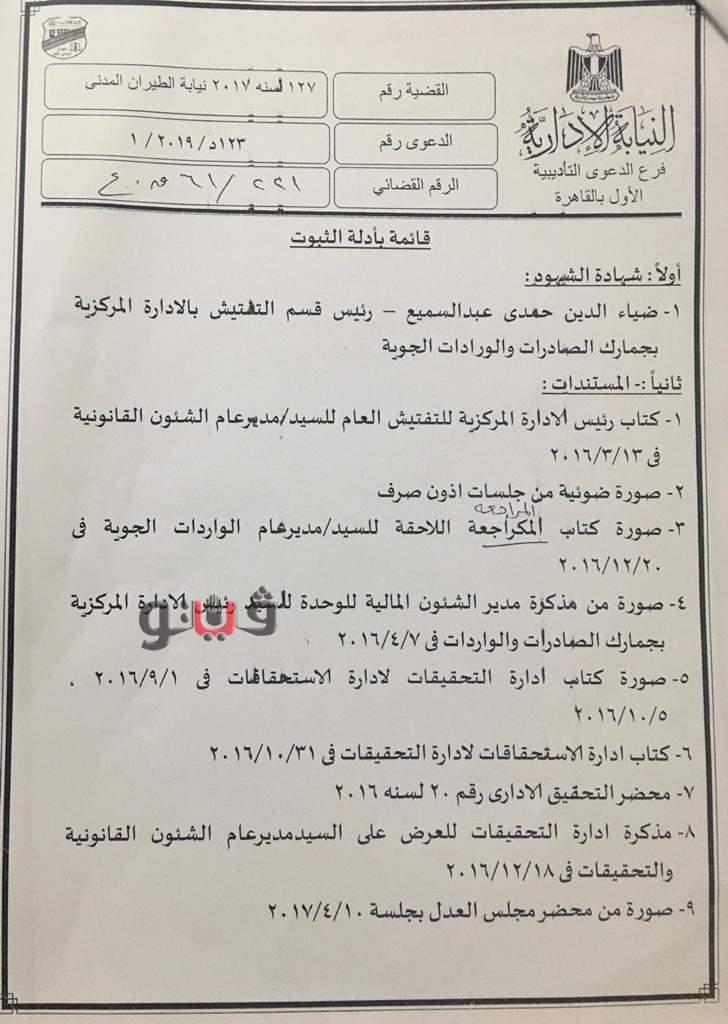 وتضمنت قائمة أدلة الثبوت شهادة ضياء حمدي عبد السميع، رئيس التفتيش بالإدارة المركزية، ومذكرة رئيس الإدارة الموجهة الى مدير عام الشئون القانونية وصور ضوئية من إذون الصرف وخطاب إدارة الإستحقاقات