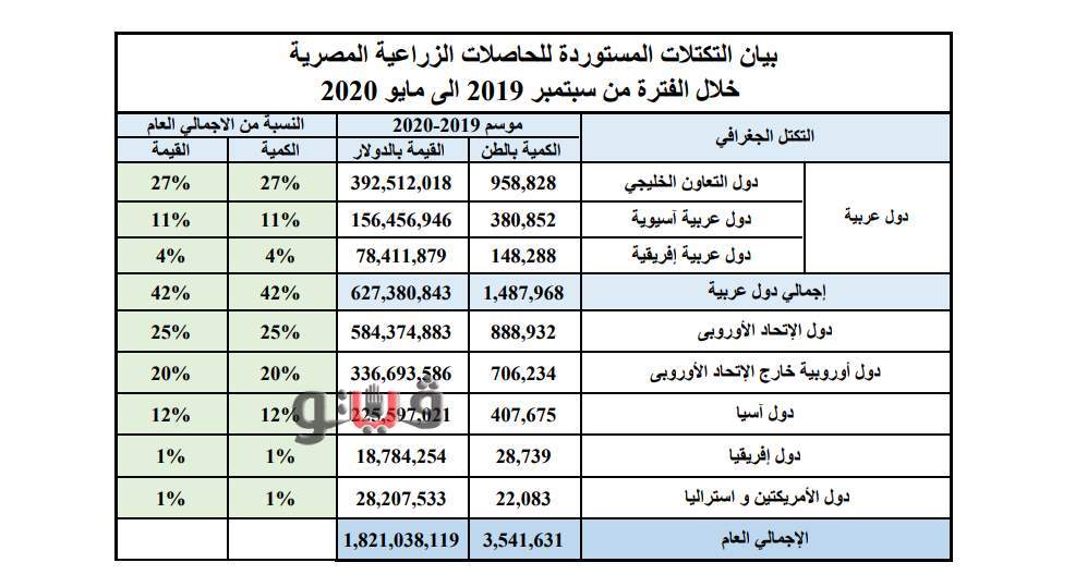 وسنتعرف من خلال هذا الإنفوجراف على أهم التكتلات المستوردة للحاصلات الزراعية المصرية فى الفترة من سبتمبر 2019 إلى مايو 2020 كالتالى