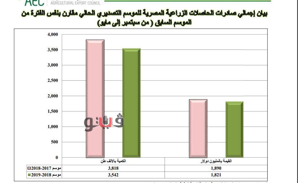 أكد تقرير صادر عن المجلس التصديري للحاصلات الزراعية أن حجم صادرات القطاع خلال الفترة من ” سبتمبر 2019- مايو 2020″ بلغت 1.821 مليار دولار مقابل 1.89 مليار دولار عن نفس الفترة من الموسم التصديري 2019/2018 بنسبة تراجع قدره 3.6%.