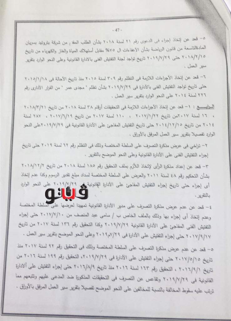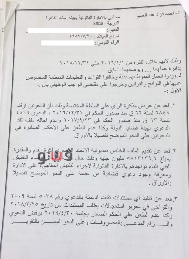 وتبين من التقرير أن المحال الأول تقاعس عن عرض مذكرة الرأي على السلطة المختصة بشأن الدعوى رقم 6849 لسنة 62 قضائية منذ صدور الحكم في 31 ديسمبر 2016، والدعوى رقم 4499 لسنة 63 منذ صدور الحكم في 23 سبتمبر 2017، ولم يقم بإحالة ملفات الدعاوى الى هيئة قضايا الدولة، وكذا عدم الطعن على الأحكام الصادرة فيها، وأهمل في الإشراف على أعمال الإدارة القانونية رئاسته مما ترتب عليه إرتكاب مساعديه المخالفات المنسوبة اليهم.