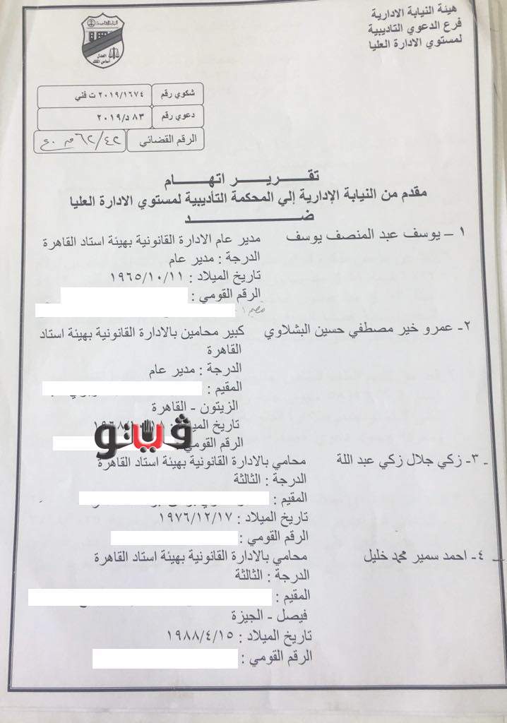 تقرير الاتهام في القضية رقم 42 لسنة 62 قضائية عليا شمل كلًا من يوسف عبد المنصف يوسف، مدير عام الإدارة القانونية بهيئة إستاد القاهرة وعمرو مصطفى حسين، كبير محامين بالإدارة القانونية، والمحامون بالهيئة أحمد سمير محمد وذكي جلال عبد الله وأحمد فؤاد عبد الحليم.