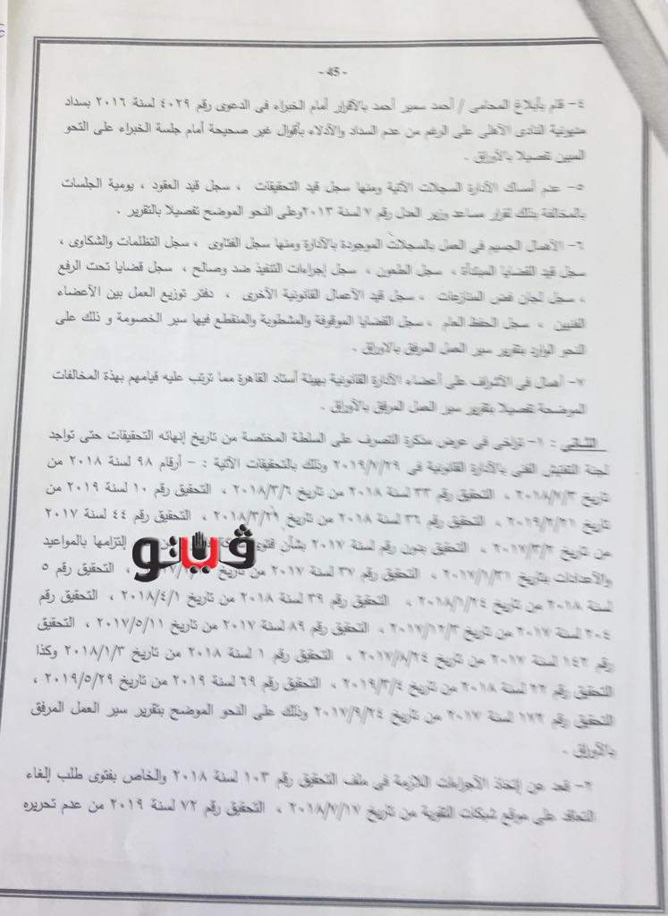 وأكد التقرير القضائي أن المحال الرابع منفردًا أقر على خلاف الحقيقة بتسوية المديونية الخاصة بالنادي الأهلي والتي بلغت قيمتها 5 مليون جنيه تقريبًا في الدعوى رقم 4029 لسنة 2016 دون عرض مذكرة بالرأي على السلطة المختصة، ولم يقم بتقديم ملف الدعوى المرفوعة على الإتحاد المصري لكرة القدم بشأن المديونية المستحقة عليه والتي بلغت 5.9 مليون جنيه تقريبًا.