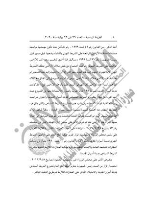 نشرت الجريدة الرسمية في عددها رقم 29، الصادر في 16 يوليو 2020، قرار رئيس الوزراء الدكتور مصطفى مدبولي رقم 24 لسنة 2020، بشأن اعتبار مشروع الشريط السياحي بمدينة أسوان الجديدة من أعمال المنفعة العامة، والاستيلاء بطريق التنفيذ المباشر على الأراضي اللازمة لتنفيذ المشروع.