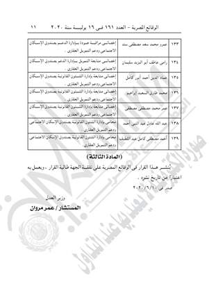 ونصت المادة الأولى والثانية للقرار على إلغاء قرار وزير العدل رقم 11449 لسنة 2018. ويخول العاملين بأجهزة المدن ومديريات الإسكان وصندوق الإسكان الاجتماعي ودعم التمويل العقاري بصفتهم الوظيفية، مأمورى الضبط القضائي وذلك بالنسبة للجرائم التي تقع بالمخالفة لأحكام القانون رقم 93 لسنة 2018، بإصدار قانون الإسكان الاجتماعي ودعم التمويل العقاري.