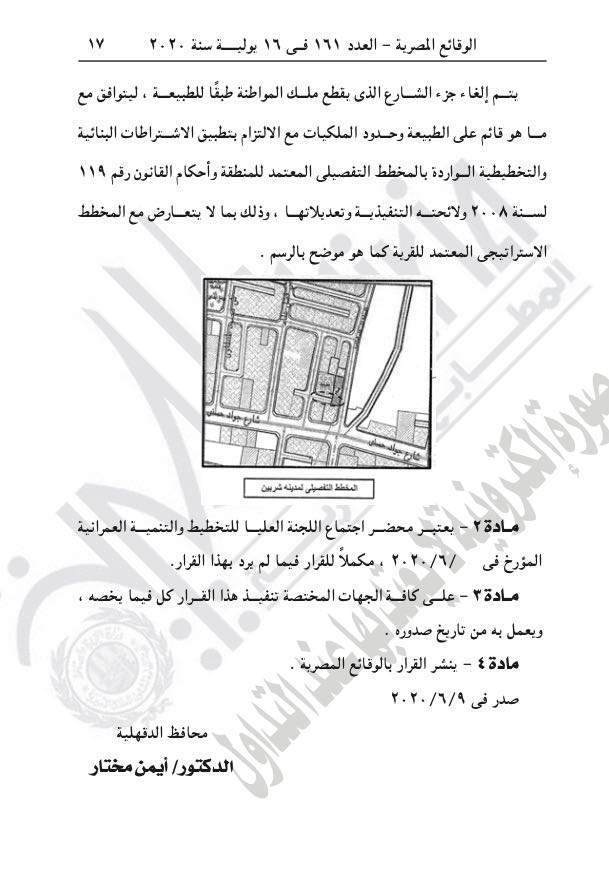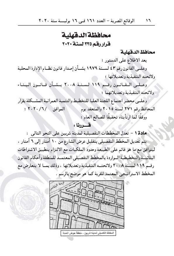 نشرت جريدة الوقائع المصرية في عددها رقم 161، الصادر في 16 يوليو 2020، قرار محافظة الدقهلية رقم 335 لسنة 2020، بشأن تعديل المخططات التفصيلية لمدينة شربين.