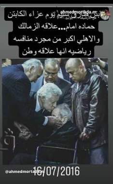 نشر أحمد مرتضى منصور عضو مجلس إدارة نادي الزمالك، صورة عبر حسابه الشخصي على موقع إنستجرام للكابتن طارق سليم أحد رموز النادي الأهلي وقت حضورة عزاء الراحل كابتن حمادة إمام نجم الزمالك السابق.