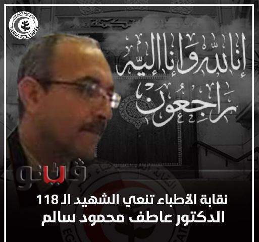 نعت النقابة العامة للاطباء الشهيد الدكتور عاطف محمود سالم استشاري الجراحة العامة ومكافحة العدوى والذي توفي إثر إصابته بفيروس كوڤيد 19.