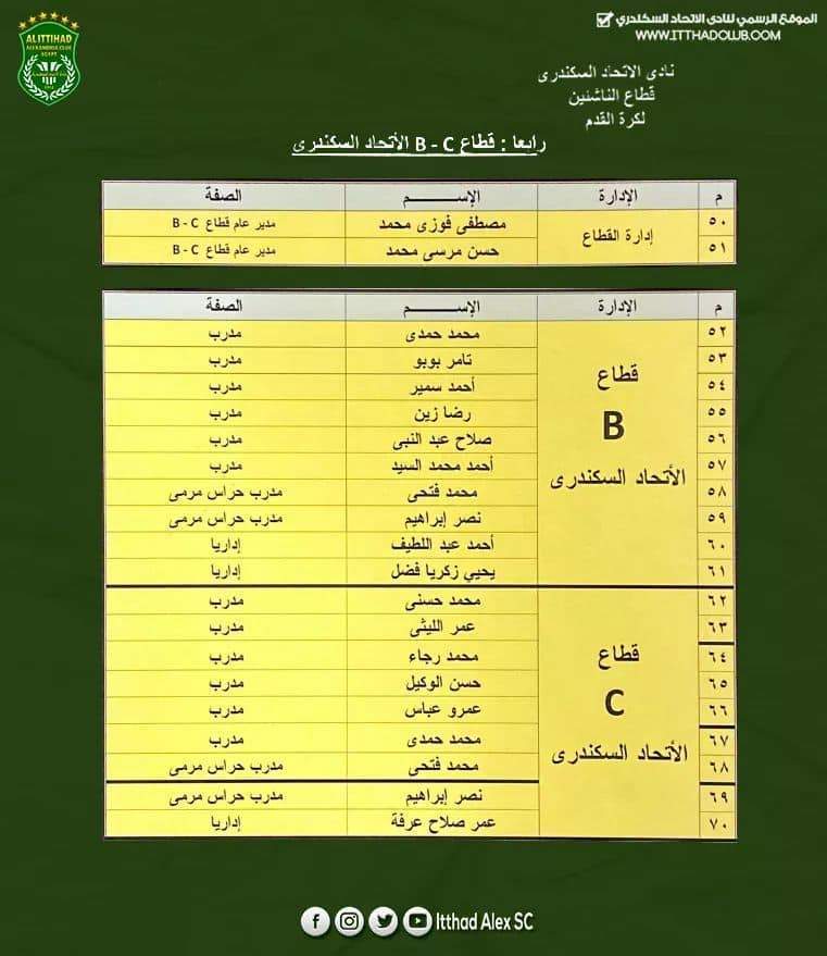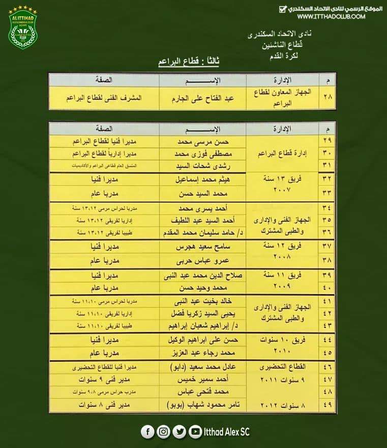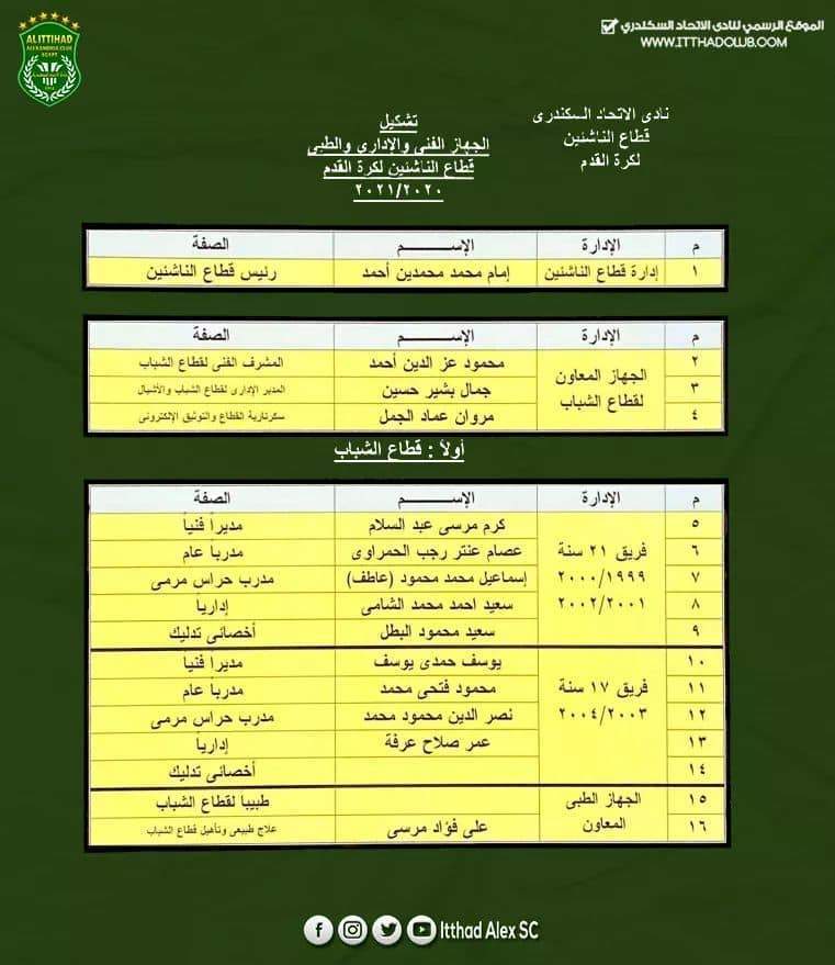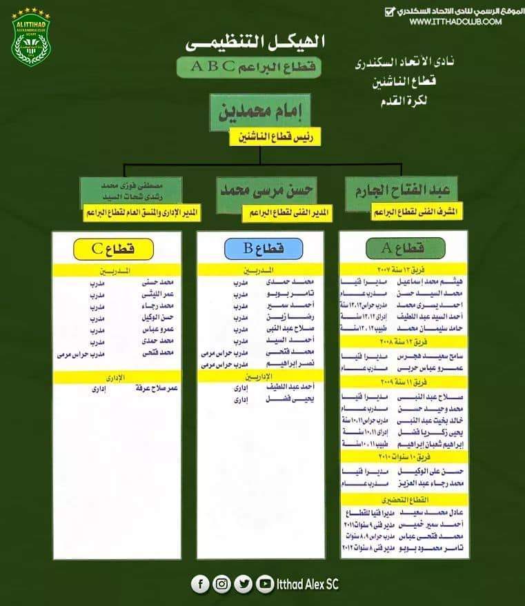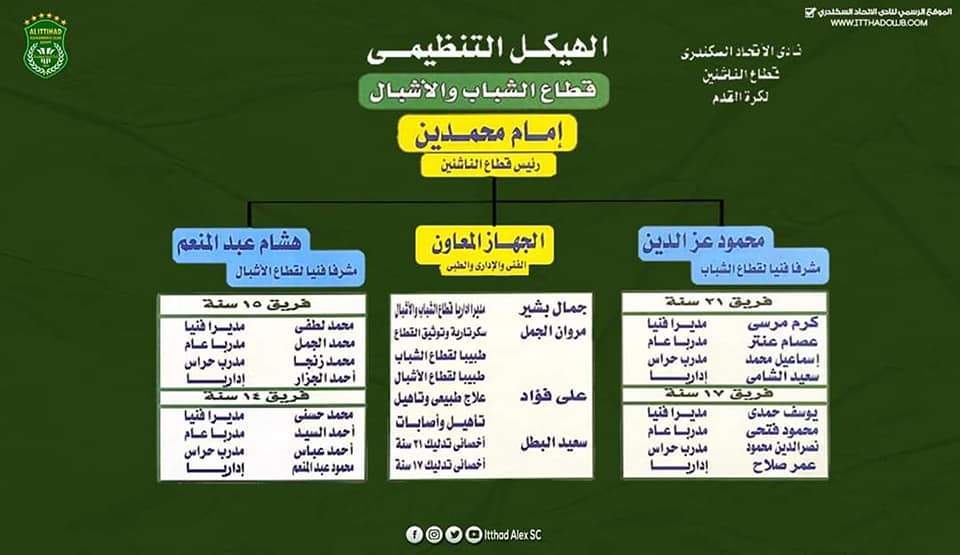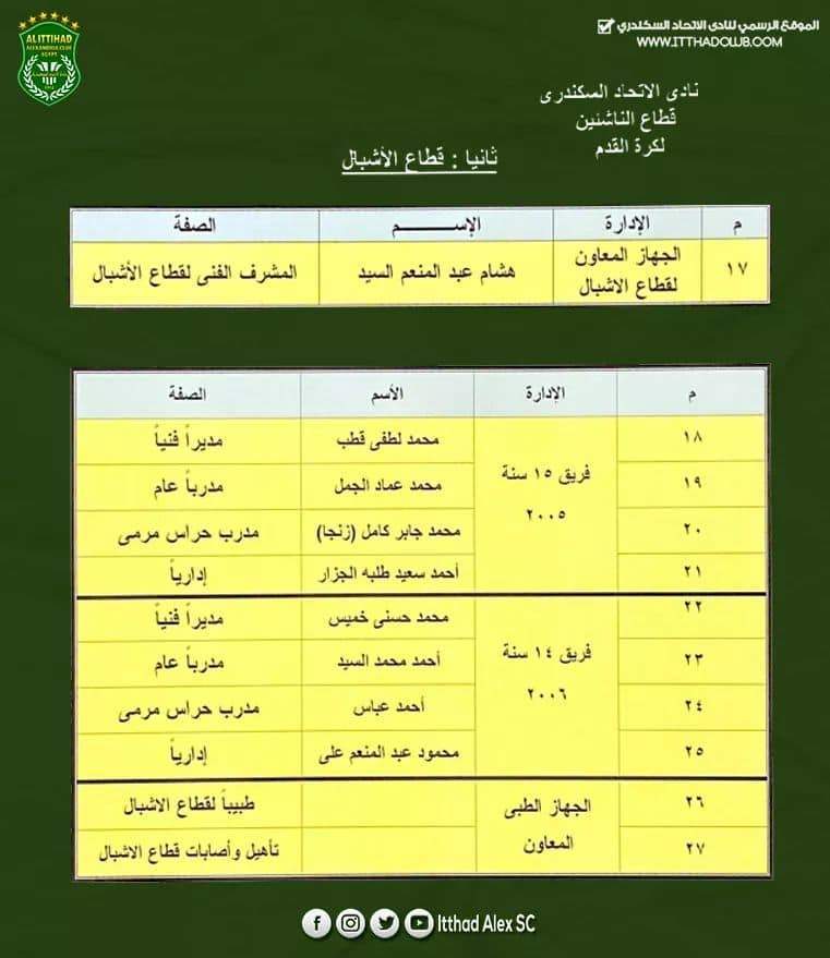 كما قرر مجلس إدارة نادى الاتحاد السكندرى برئاسة محمد مصيلحى إعتماد تشكيل الاجهزة الفنية و الادارية لفرق قطاع الناشئين لكرة القدم المقدم من إمام محمدين رئيس القطاع وفقا لرؤيته للمرحلة المقبلة.
