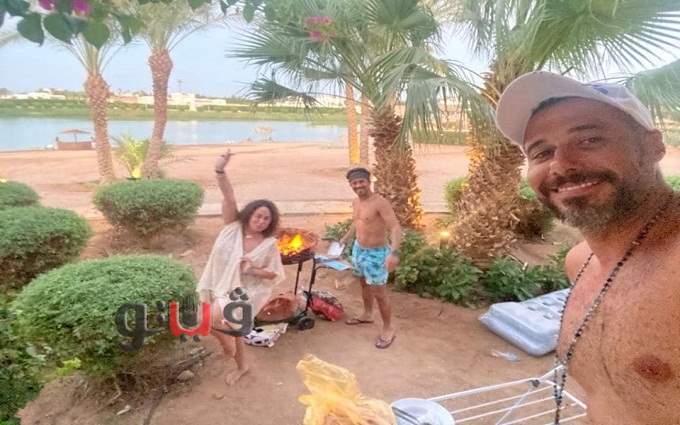 كما ظهرت إنجي وأحمد السعدني في صورة أخرى على شاطئ إحدى البحيرات وظهر في الخلفية الفنان أحمد داود الذي كان مشغولا بإحضار الطعام.
