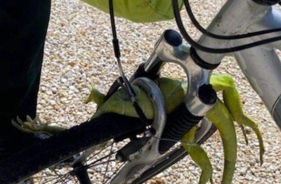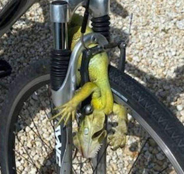 والتصاق السحلية من نوع "الإيجوانا" في مقدمة الدراجة الهوائية، مشيراً
