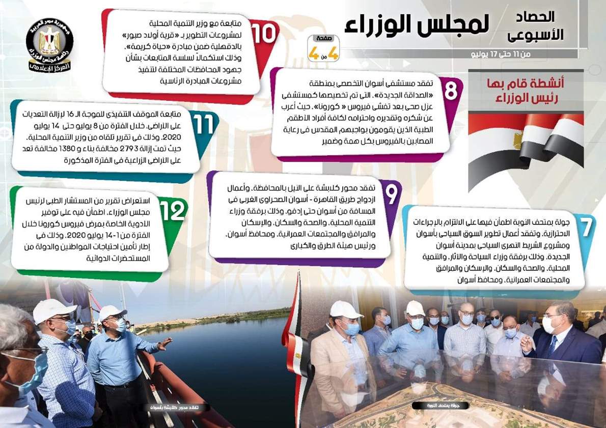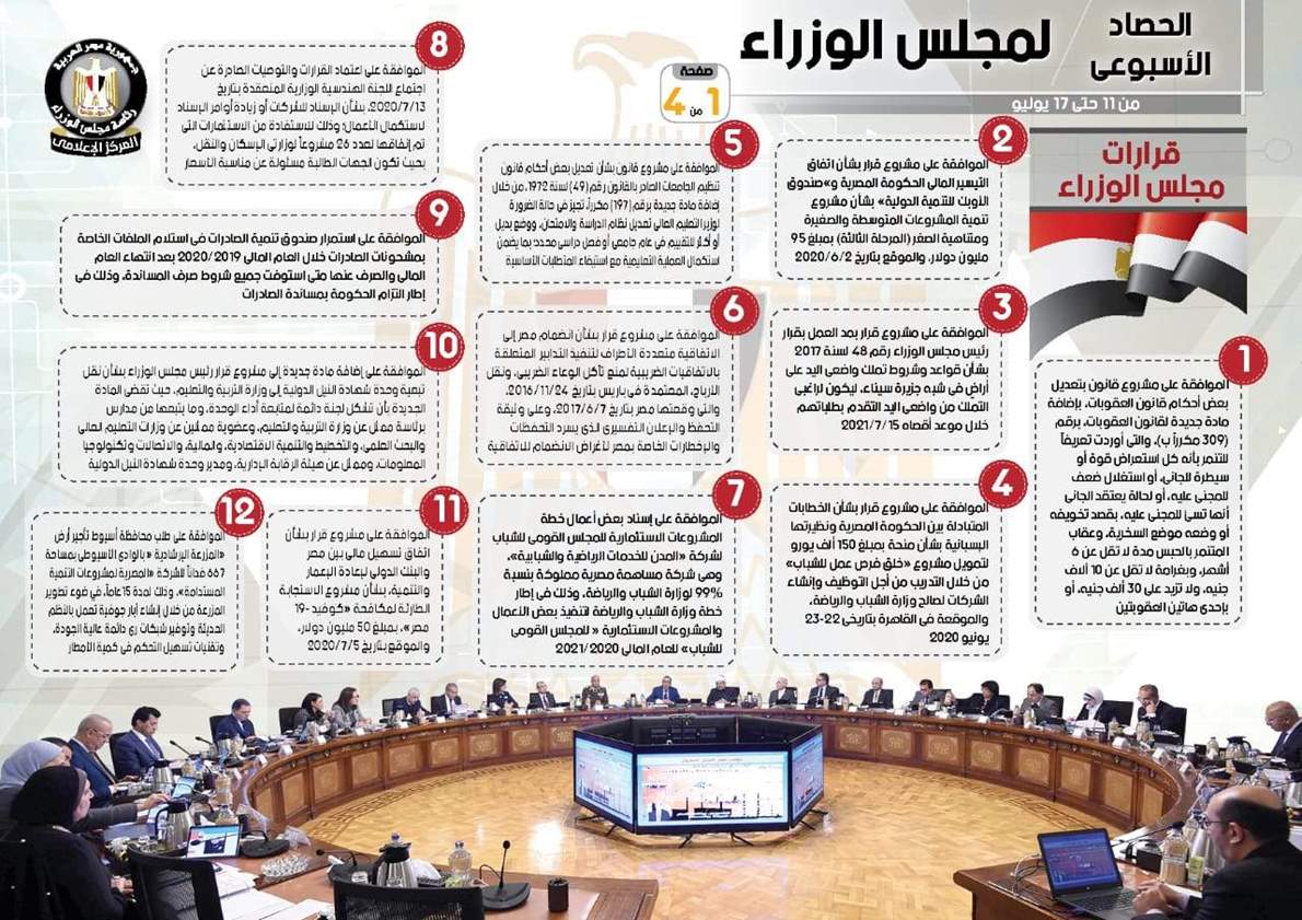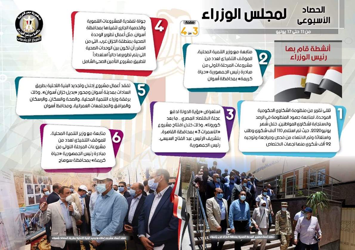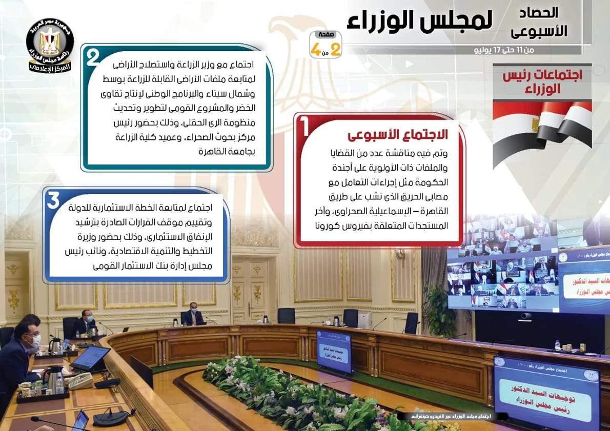 نشر المركز الإعلامي لمجلس الوزراء، إنفوجرافاً سلط من خلاله الضوء على الحصاد الأسبوعي لمجلس الوزراء، وذلك خلال الفترة من 11 حتى 17 يوليو 2020، والذي تضمن الموافقة على عدد من القرارات، فضلاً عن الاجتماعات التي عقدها الدكتور مصطفى مدبولي، رئيس مجلس الوزراء، بالإضافة إلى ما قام به من أنشطة.
