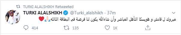 علق تركي آل الشيخ رئيس هيئة الترفيه في المملكة العربية السعودية على الصعود المباشر لناديي هويسكا وقادش لدوري القسم الأول لكرة القدم في إسبانيا وتأهل ألميريا للملحق المؤهل لـ الليجا.