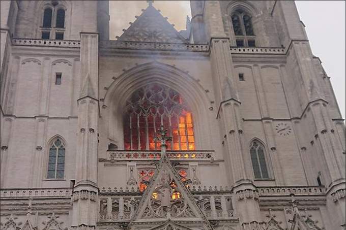 تداول نشطاء مواقع التواصل الاجتماعي "فيس بوك وتويتر" فيديو للحظة نشوب حريق في كاتدرائية نانت غرب فرنسا، صباح اليوم السبت، حيث شيدت كاتدرائية نانت في القرن الخامس عشر، وتعد من الكاتدرائيات العريقة في فرنسا.