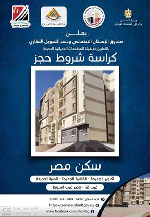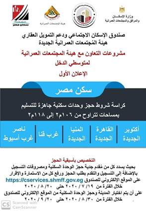 - مشروع سكن مصر، حيث يتم به طرح وحدات في 5 مدن، هي: أكتوبر الجديدة - المنيا الجديدة – غرب قنا – ناصر غرب أسيوط – القاهرة الجديدة، بإجمالي 691 وحدة سكنية بمساحات تتراوح من 106-118م2 بأسعار تتراوح من 364.000 إلى 948.454.