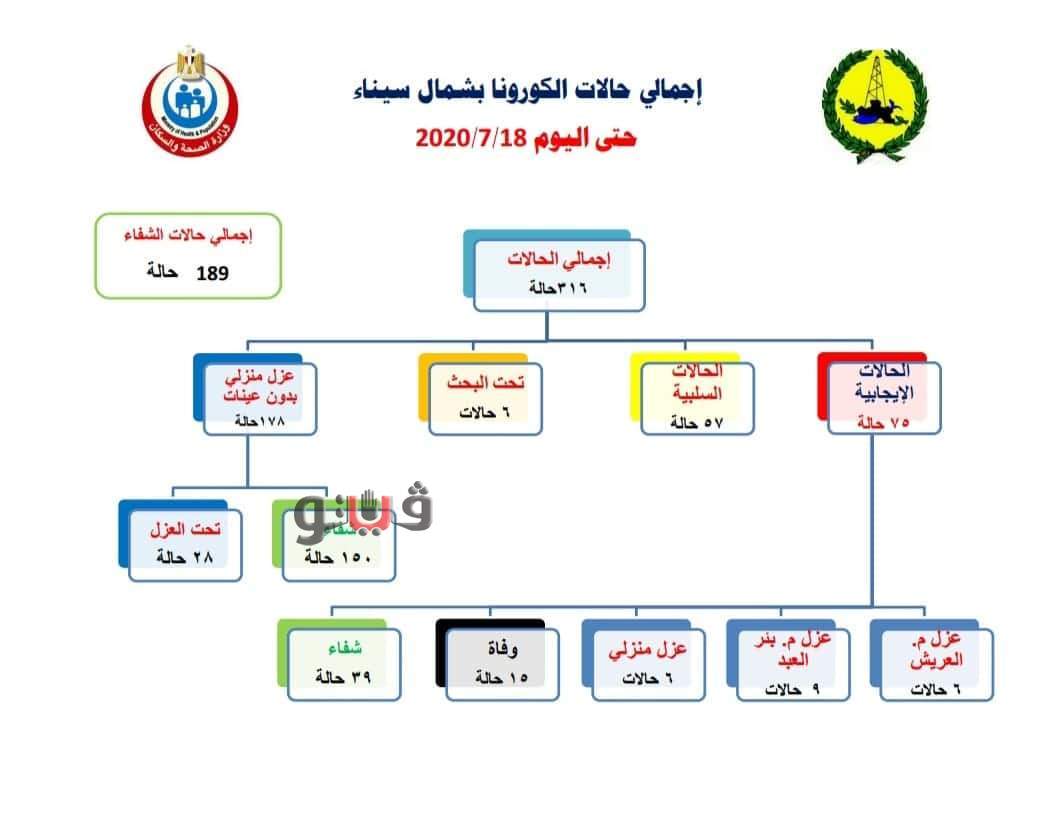 أعلنت مديرية الصحة بمحافظة شمال سيناء عن ارتفاع حالات الشفاء من مصابى فيروس كورونا ل١٨٩ حالة منذ تفشى الوباء ووفاة ١٥ حالة منذ تفشى الوباء.