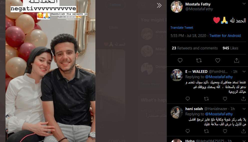 نشر مصطفى فتحي، لاعب فريق الزمالك، صورة له برفقة زوجته عبر صفحته الشخصية بموقع التواصل الاجتماعي إنستجرام عقب شفائه من الإصابة بفيروس كورونا المستجد.