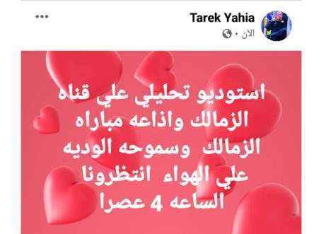 وكتب طارق يحيى عبر حسابه الشخصي على موقع فيس بوك: "إستوديو تحليلي على قناة الزمالك وإذاعة مباراة الزمالك وسموحة الودية على الهواء انتظرونا الساعة 4 عصرًا".