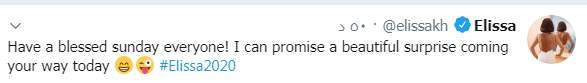 وكتبت إليسا «يوم أحد مبارك للجميع. يمكنني أن أعدكم بمفاجأة جميلة قادمة في طريقكم اليوم».