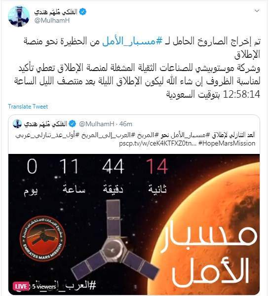 العد التنازلي لإطلاق #مسبار_الأمل نحو #المريخ #العرب_إلى_المريخ #أول_عد_تنازلي_عربي #HopeMarsMission https://t.co/epWh9LqnBq— الفلكي مُلهَم هندي (@MulhamH) July 19, 2020