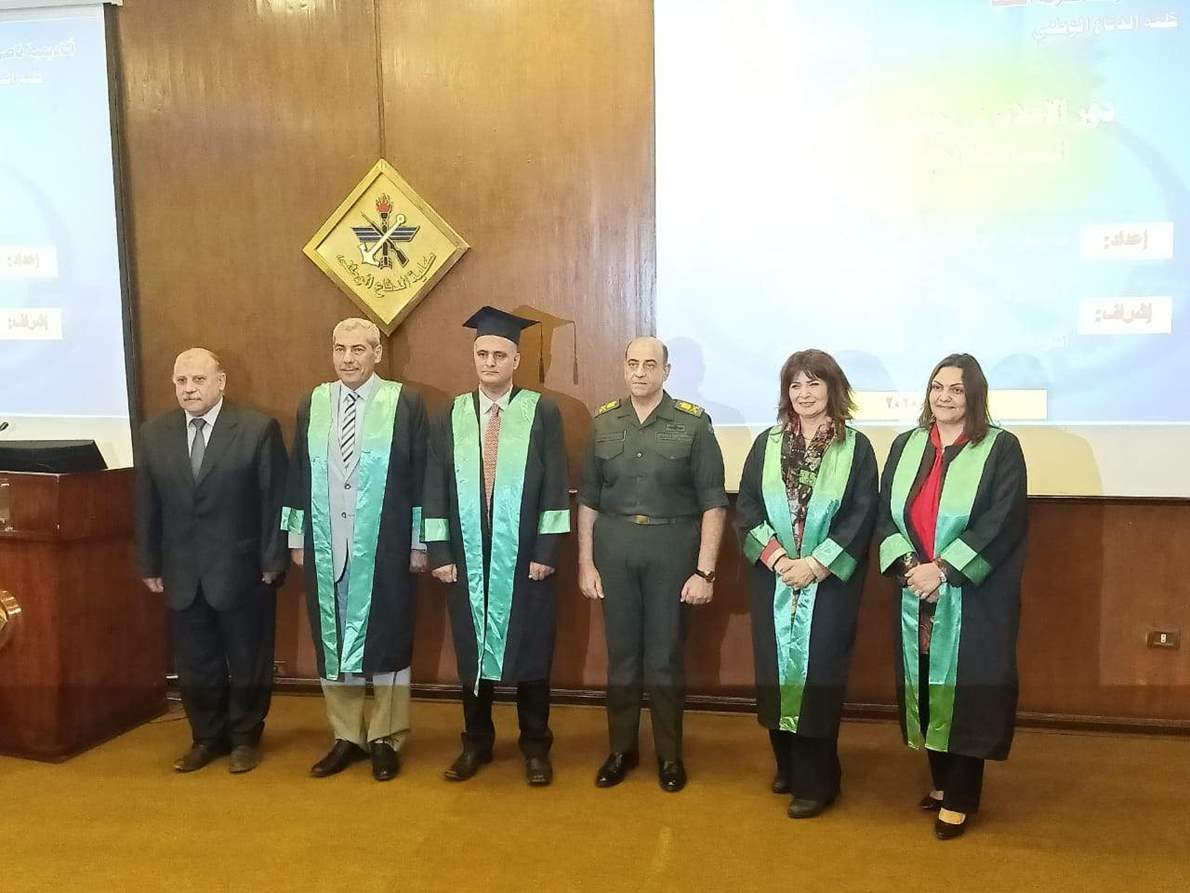 ضمت لجنة المناقشة كلاً من الدكتورة حنان يوسف، أستاذ الإعلام بجامعة عين شمس وعميد كلية اللغة والإعلام بالأكاديمية العربية للعلوم والتكنولوجيا والنقل البحرى، والدكتورة دينا أبو زيد، أستاذ الإعلام بجامعة عين شمس، واللواء أركان حرب الدكتور محمد حسنى عزب، واللواء أركان حرب الدكتور حسام أنور، مستشارى أكاديمية ناصر العسكرية.