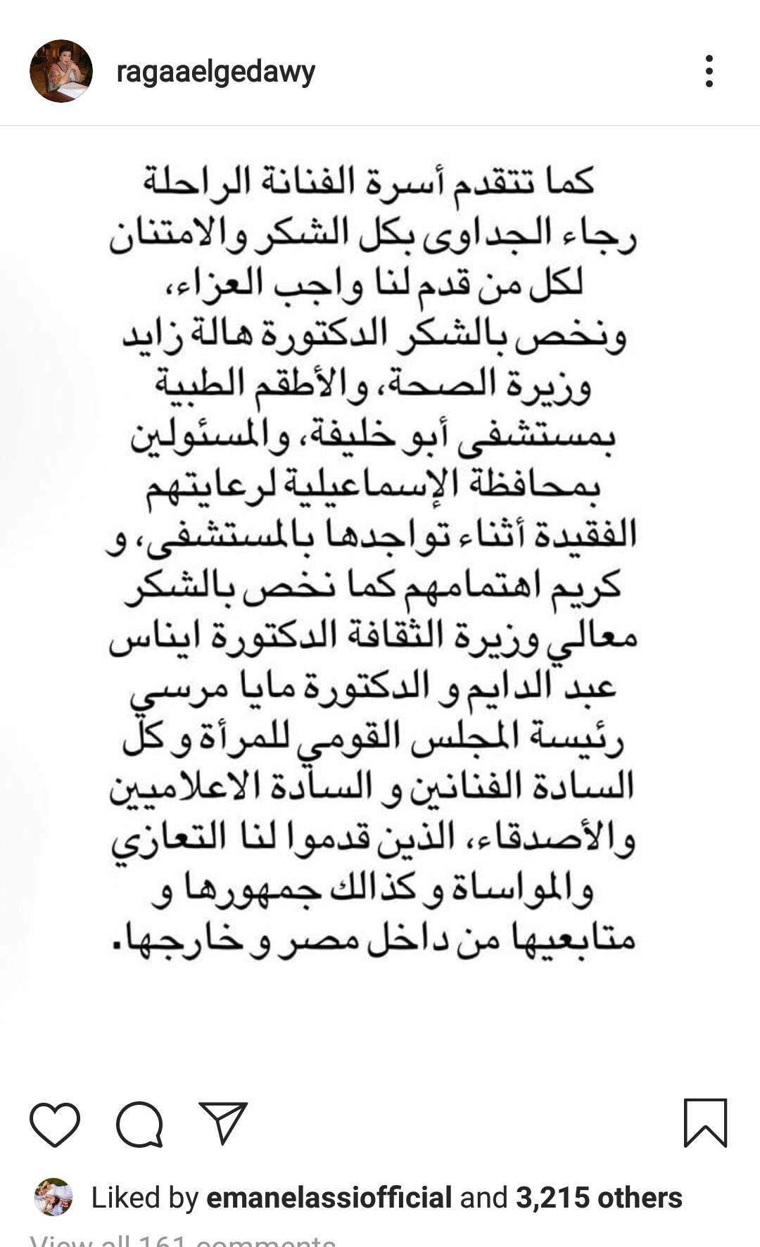 وأصدرت الأسرة بياناً جاء كالتالى: "تتقدم أسرة الفنانة الراحلة رجاء الجداوي بكل الشكر والامتنان لكل من قدم لنا واجب العزاء، ونخص بالشكر الدكتورة هالة زايد وزيرة الصحة، والأطقم الطبية بمستشفى أبو خليفة والمسئولين بمحافظة الإسماعيلية لرعايتهم الفقيدة اثناء تواجدها بالمستشفى وكرم اهتمامهم".