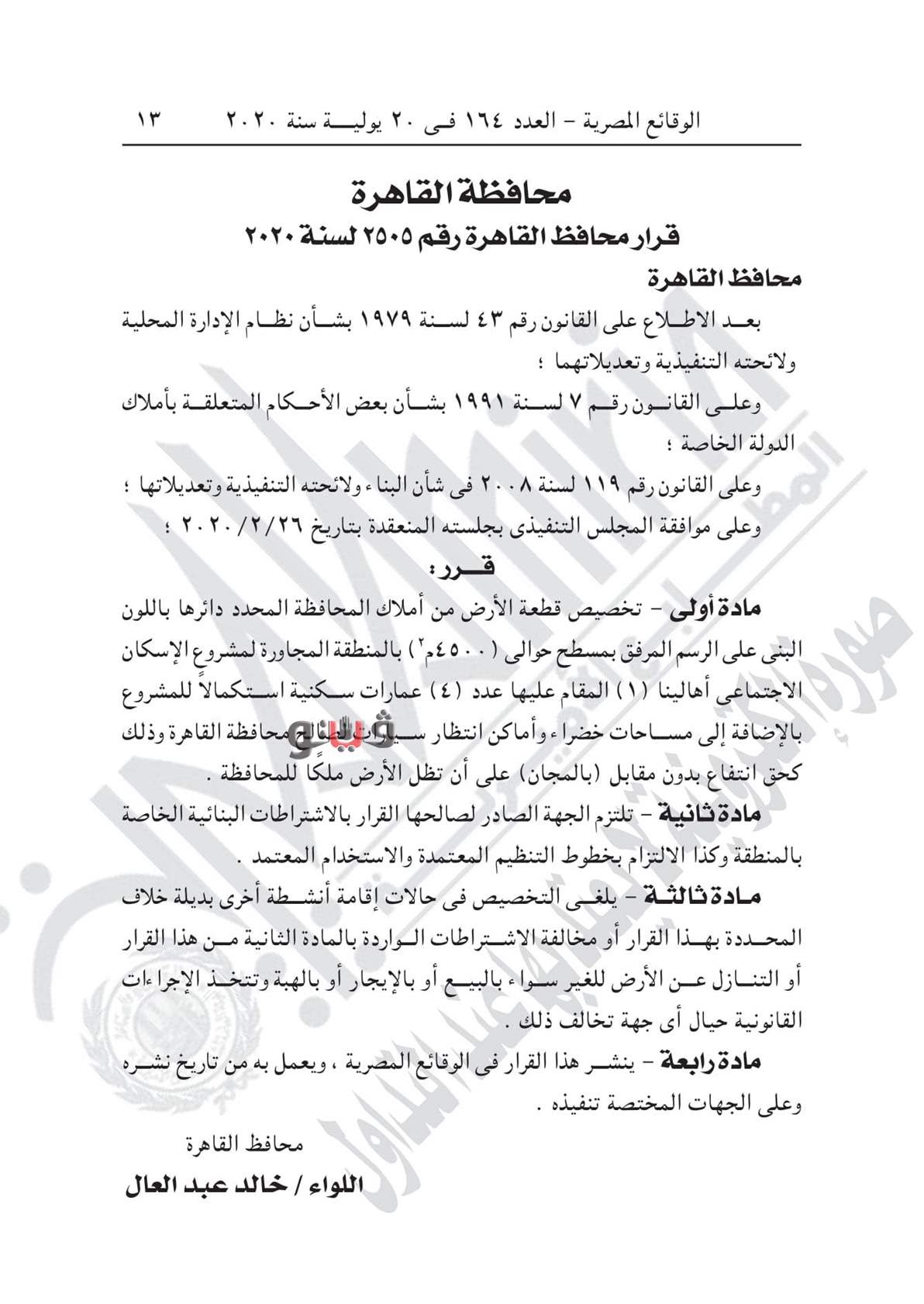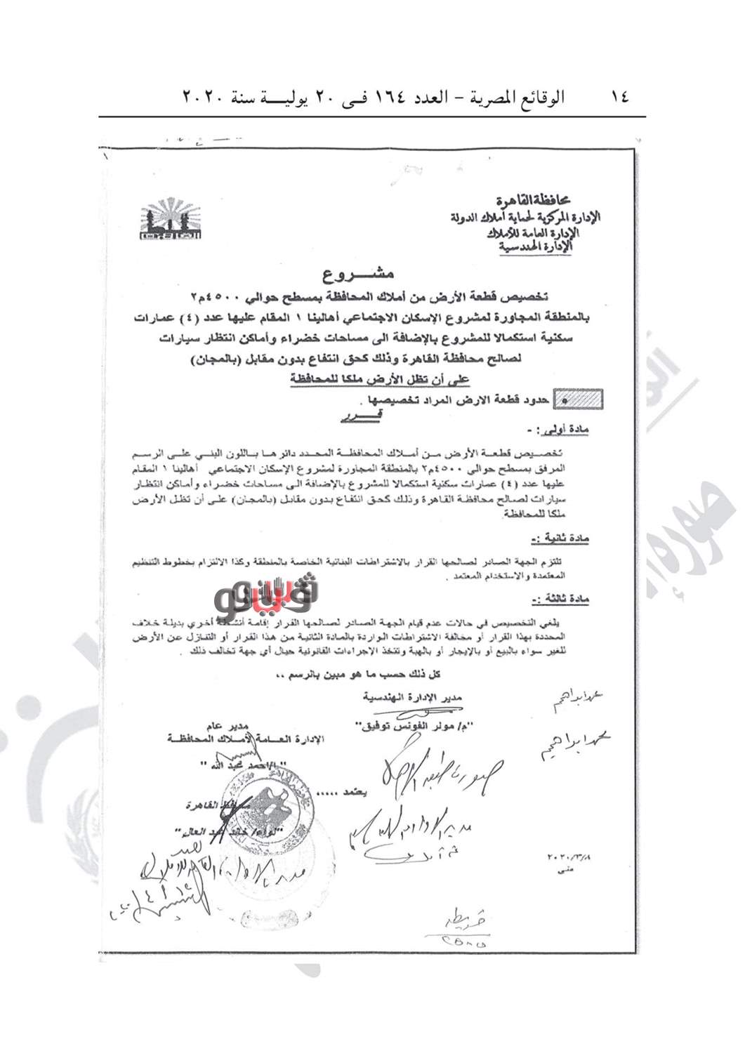 نشرت جريدة الوقائع المصرية في عددها رقم 164، الصادر في 20 يوليو 2020، قرار محافظة القاهرة رقم 2505 لسنة 2020، بتخصيص قطعة أرض من أملاك المحافظة لمشروع الإسكان الاجتماعي أهالينا (1).
