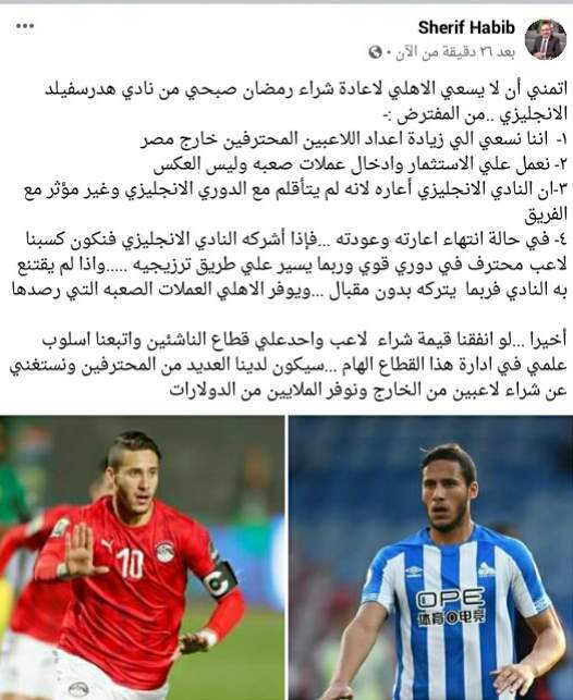 وتمني حبيب من إدارة الأهلي عبر تدوينة عبر صفحته علي موقع التواصل الإجتماعي فيس بوك عدم سعي الاهلي لاعادة شراء رمضان صبحي من نادي الدوري الإنجليزي.