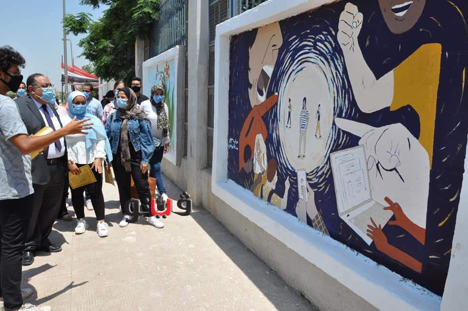 تجميل سور جامعة حلوان بلوحات إبداعية بأيدي طلاب كلية التربية الفنية
