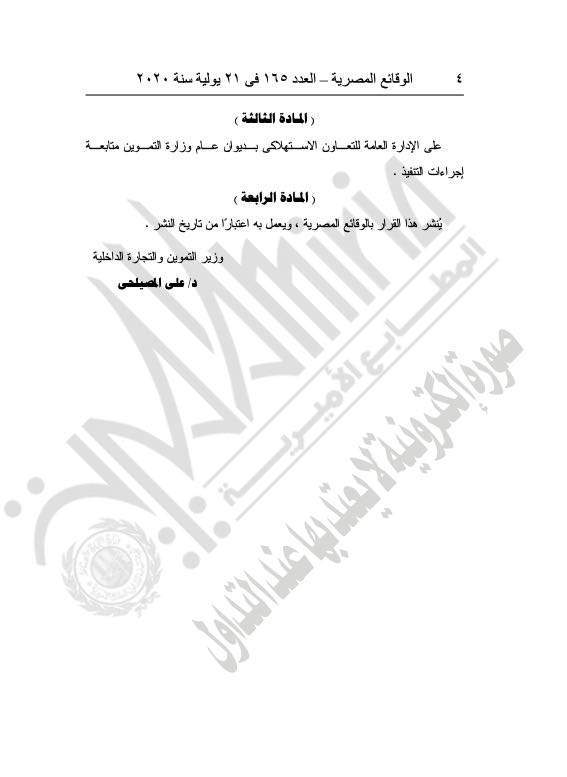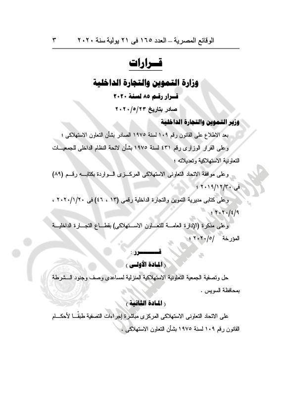 نشرت جريدة الوقائع المصرية في عددها رقم 165، الصادر في 21 يوليو 2020، قرار وزارة التموين والتجارة الداخلية رقم 85 لسنة 2020، بشأن حل وتصفية الجمعية التعاونية الاستهلاكية المنزلية لمساعدي وصف وجنود الشرطة بمحافظة السويس.