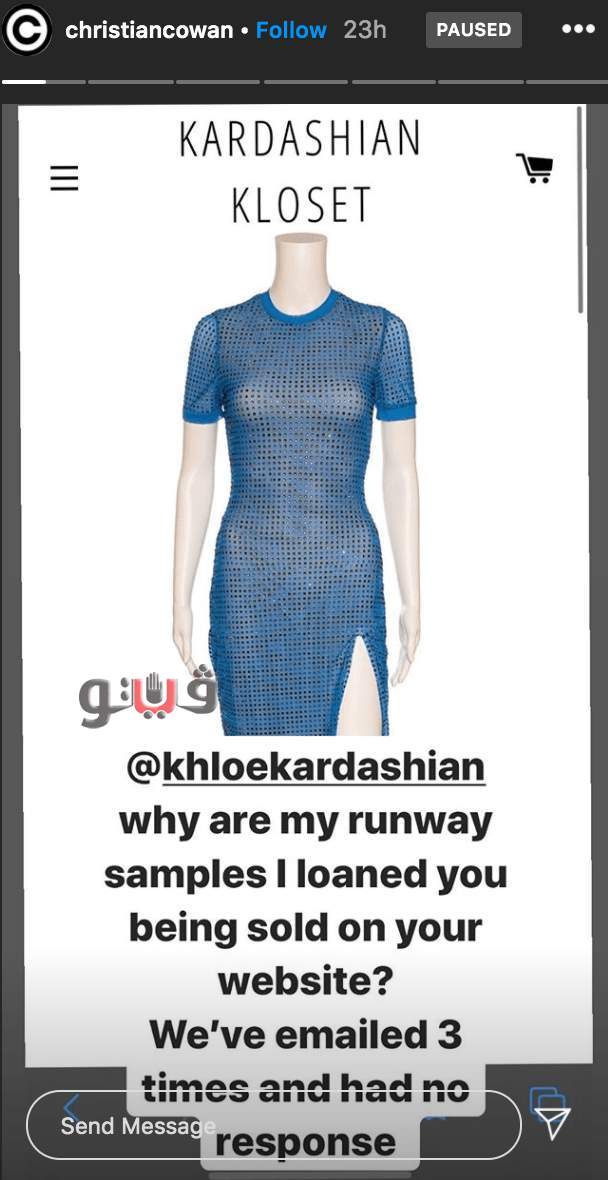 ورأى مصمم الأزياء كوان ذلك عبر صفحة إنستغرام الخاصة بكلوي فعلق: "لماذا الفستان الذي أقرضته لكِ معروضًا للبيع على الموقع؟ لقد أرسلنا لكِ عبر البريد الإلكتروني ثلاثة مرات حول إعادة الفستان ولكن لم نتلق أي رد".
