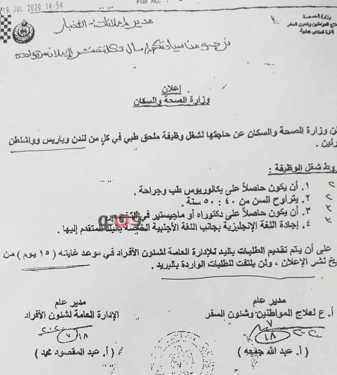 أعلنت وزارة الصحة والسكان عن حاجتها لشغل وظيفة ملحق طبي في كل من لندن وباريس وواشنطن.