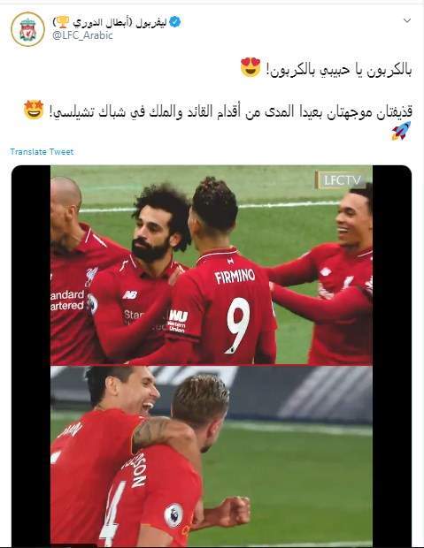 وكتب ليفربول تغريدة على تويتر قال فيها: "بالكربون يا حبيبي بالكربون! قذيفتان موجهتان بعيدتا المدى من أقدام القائد والملك في شباك تشيلسي!"