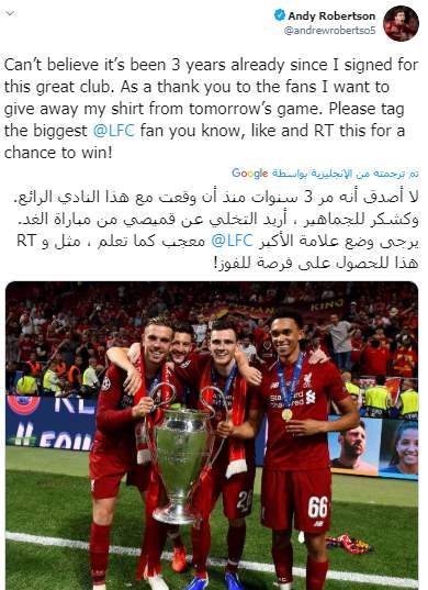 وكتب روبرتسون، على حسابه بموقع التواصل الاجتماعي تويتر: "لا أصدق مرور 3 سنوات على توقيعي لهذا النادي الرائع".