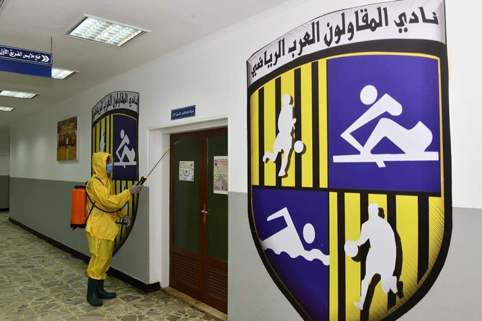 أجرى مسئولو نادي المقاولون العرب الإجراءات الاحترازية وكل وسائل التعقيم والتطهير قبل مباراة الفريق الأول لكرة القدم بالنادي أمام نادي أسوان والتي ستقام السابعة مساء اليوم على ملعب النادي بالجبل الأخضر.
