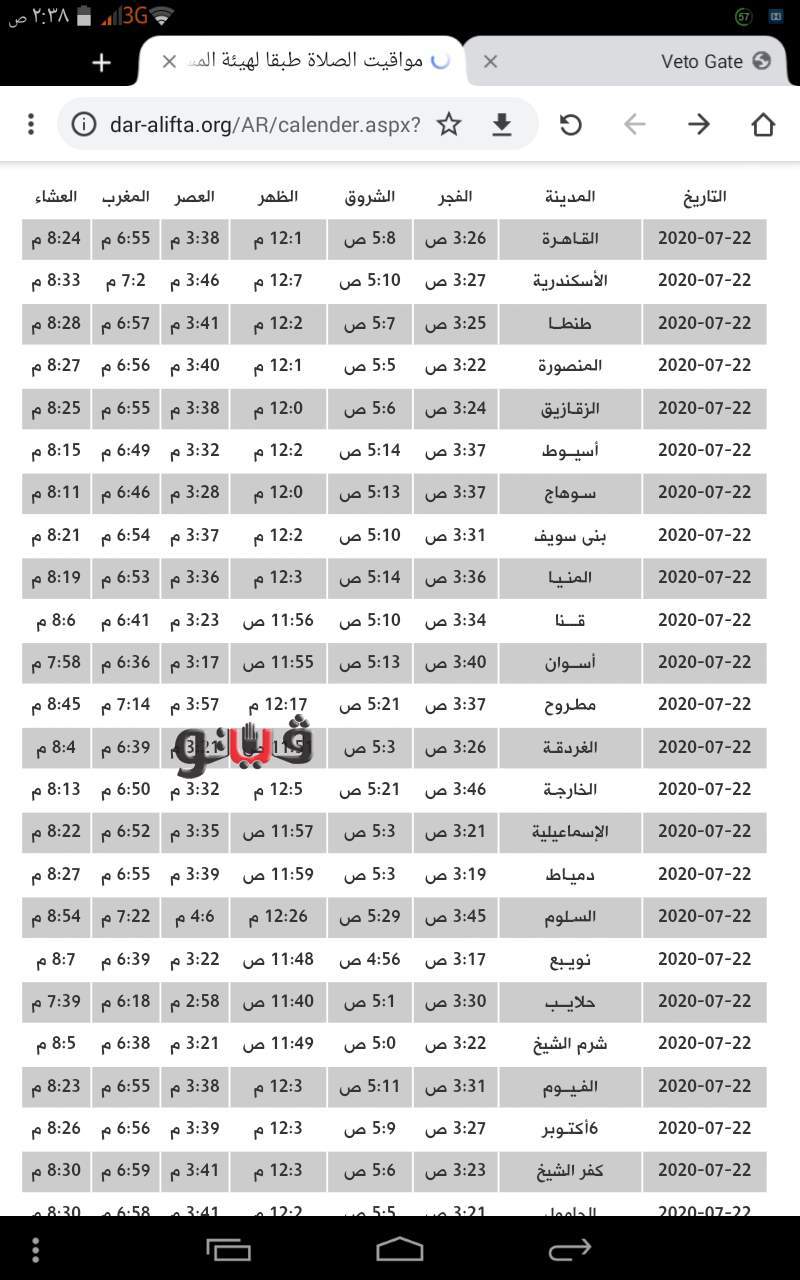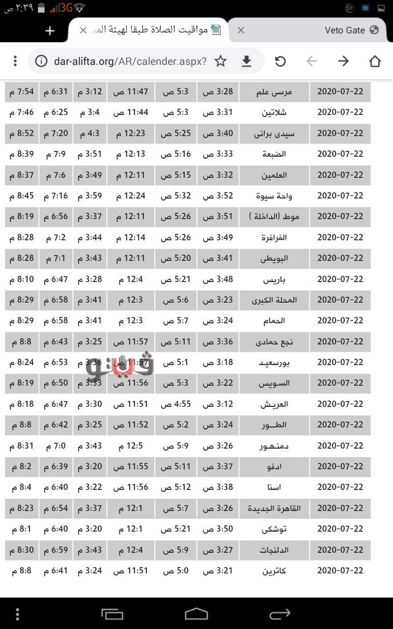 ويوضح الجدول مواقيت الصلاة اليوم كالتالي:،