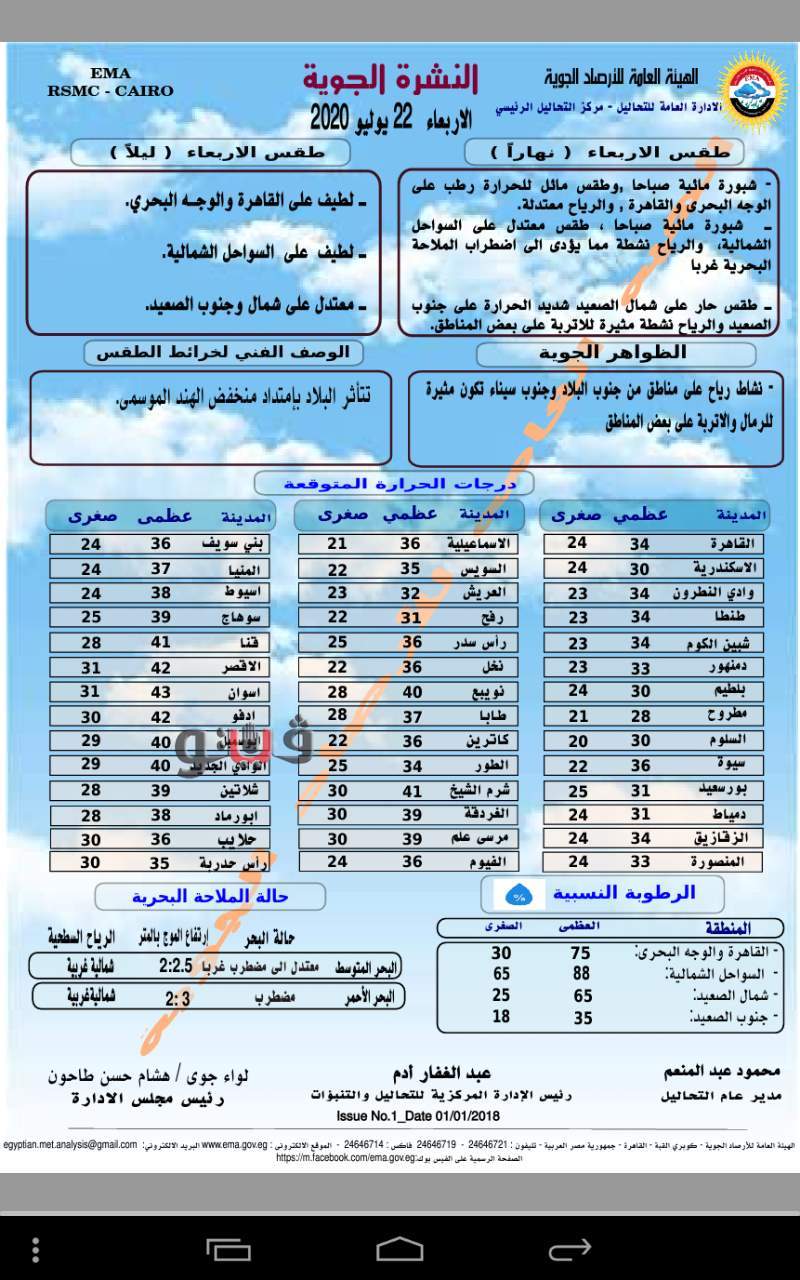 أعلنت هيئة الأرصاد الجوية حالة الطقس اليوم الأربعاء وتوقعت أن يسود طقس مائل للحرارة رطب على القاهرة الكبرى والوجه البحري، ويسود طقس معتدل على السواحل الشمالية الشرقية والغربية و على جنوب سيناء وسلاسل البحر الأحمر وشديد الحرارة على جنوب البلاد.