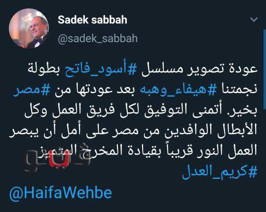 وكتب “الصباح” عبر حسابه الشخصي على موقع التدوينات القصيرة “تويتر”، قائلًا: “عودة تصوير مسلسل أسود فاتح بطولة نجمتنا هيفاء وهبه بعد عودتها من مصر بخير، أتمنى التوفيق لكل فريق العمل وكل الأبطال الوافدين من مصر على أمل أن يبصر العمل النور قريبًا بقيادة المخرج المتميز كريم العدل.