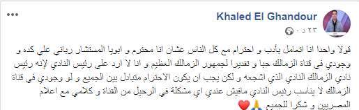 كما كتب الغندور منشورًا آخر بعده قائلًا: "قولًا واحدًا أنا أتعامل بأدب واحترام مع كل الناس عشان أنا محترم وأبويا المستشار رباني على كده، وجودي في قناة الزمالك حبًا وتقديرًا لجمهور الزمالك العظيم".