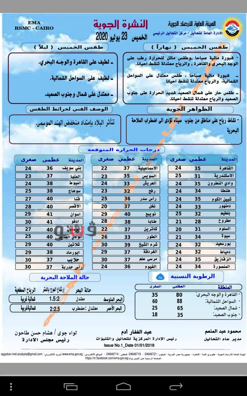 وفيما يلى بيان بدرجات الحرارة المتوقعة اليوم على مدن ومحافظات مصر..