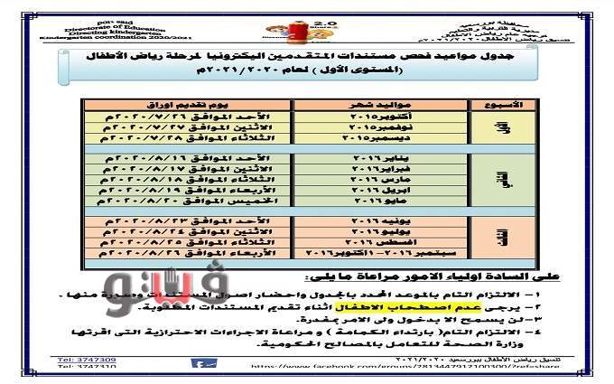أعلنت مديرية التربية والتعليم ببورسعيد جدول ومواعيد تسليم وفحص المستندات الورقية للمتقدمين لمرحلة رياض الأطفال المستوى الأول للعام الدراسى ٢٠٢٠ - ٢٠٢١ .