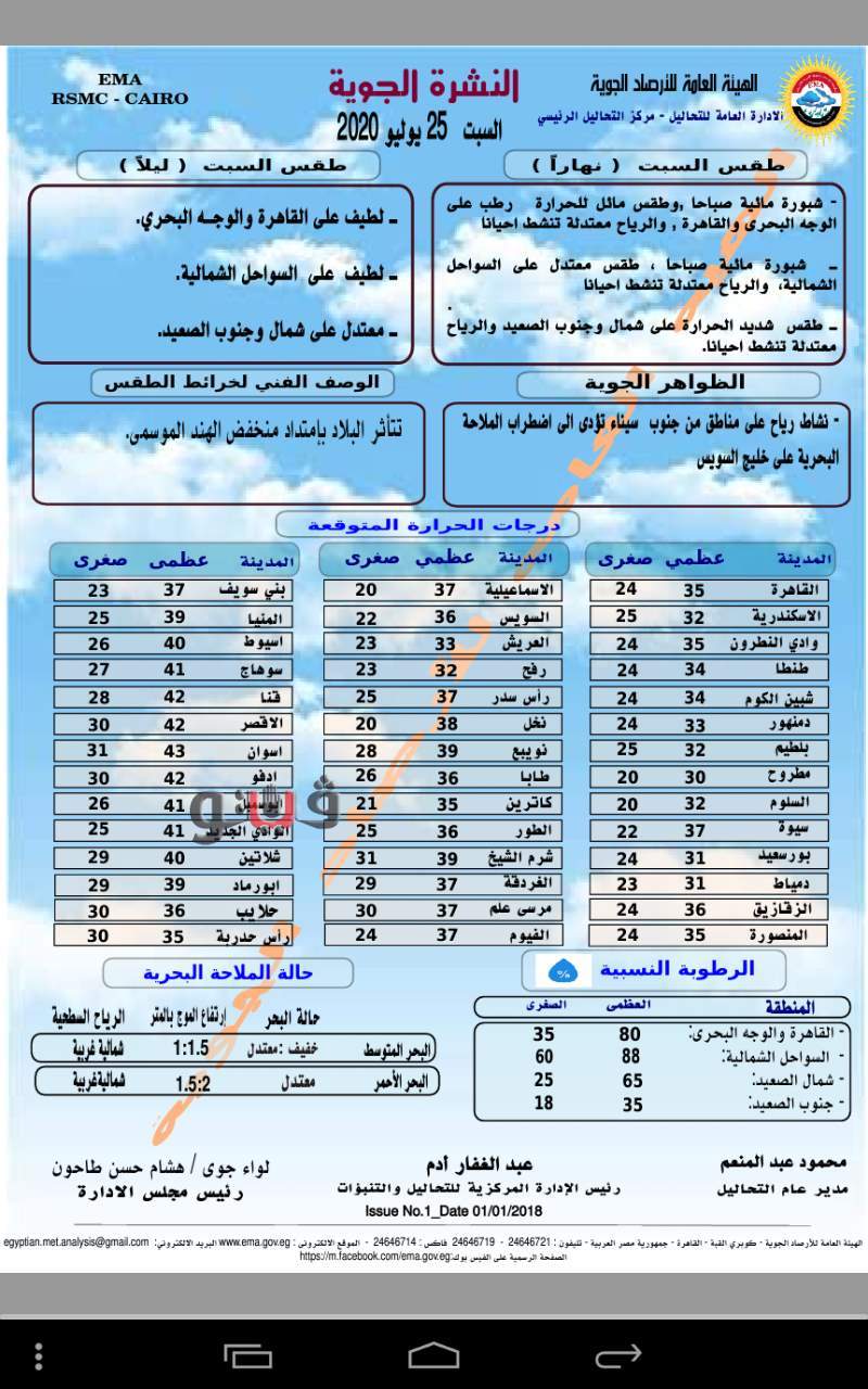 وفيما يلى بيان بدرجات الحرارة المتوقعة اليوم على مدن ومحافظات مصر..