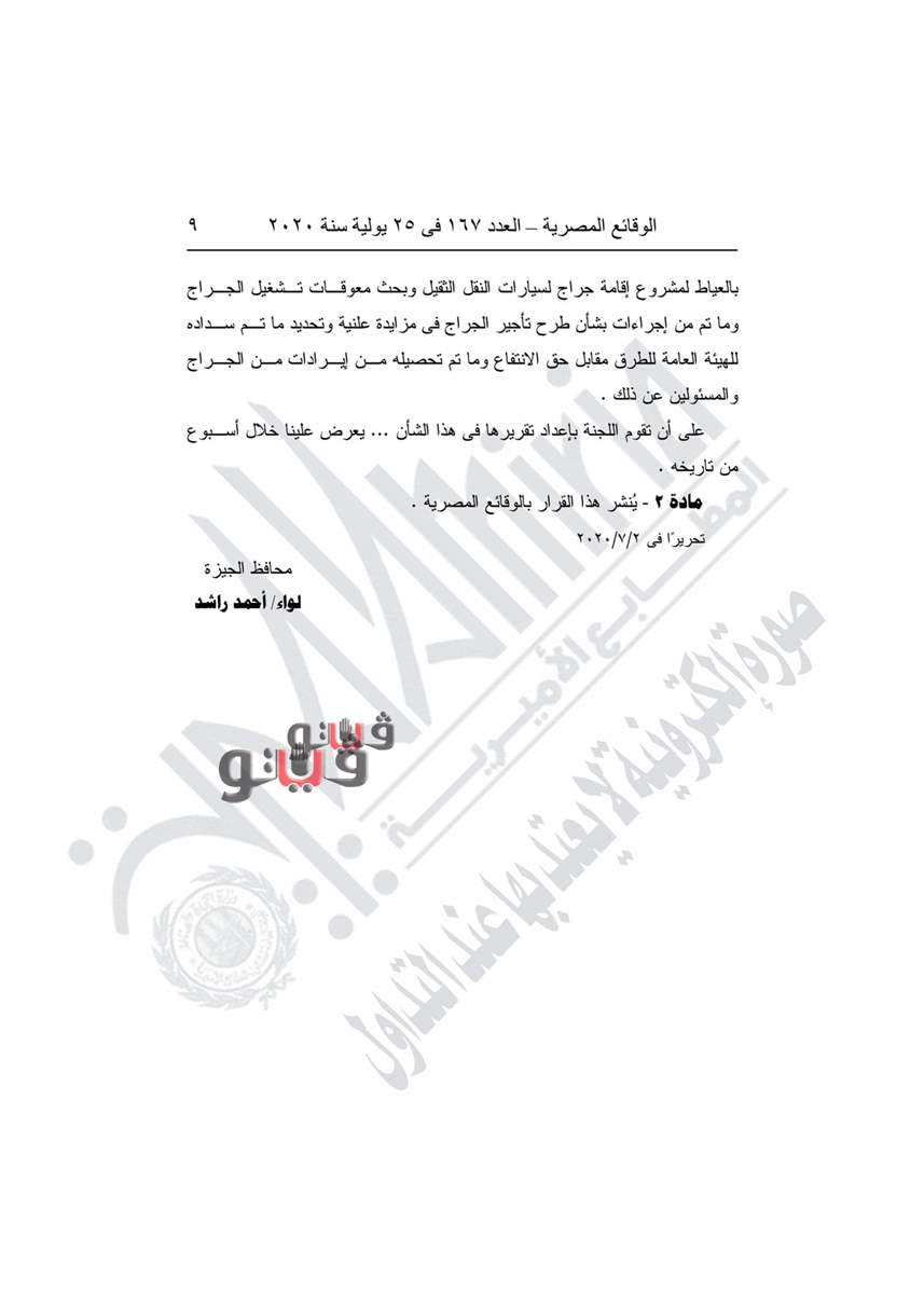نشرت جريدة الوقائع المصرية في عددها رقم 167، الصادر في 26 يوليو 2020، قرارا محافظة الجيزة بتجديد العمل بإيقاف تراخيص سيارات الرحلات، وتعديل المادة الأولى بمشروعات البرك التي ردمت.