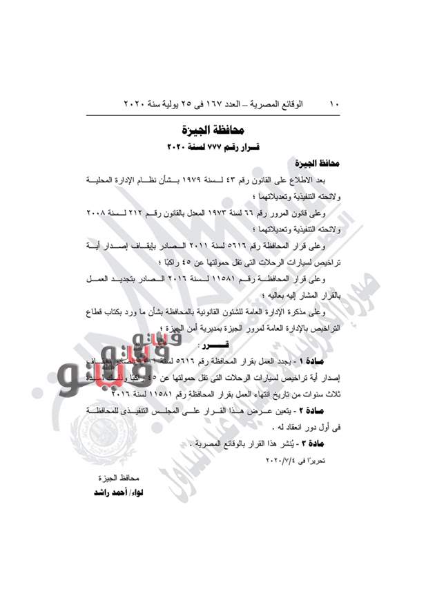 وحمل القرار الاول رقم 777 لسنة 2020، بتجديد العمل بقرار المحافظة رقم 5616 لسنة 2011 الصادر بإيقاف إصدار أية تراخيص لسيارات الرحلات التي تقل حمولتها عن 45 راكبًا وذلك لمدة ثلاث سنوات من تاريخ انتهاء العمل بقرار المحافظة رقم 11581 لسنة 2016.