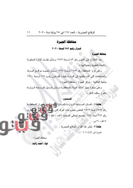 وحمل القرار الثاني رقم 782 لسنة 2020، بتعديل المساحة الواردة بالمادة الأولى من قرار المحافظة رقم 1983 لسنة 1977 الخاص بمشروعات البرك التي ردمت بالأمر العسكري رقم 363 لسنة 1943 ليصبح إجمالي المسطح 21 ف، 8ط، 16س بدلاً من 21ف، 18ط، 16س.